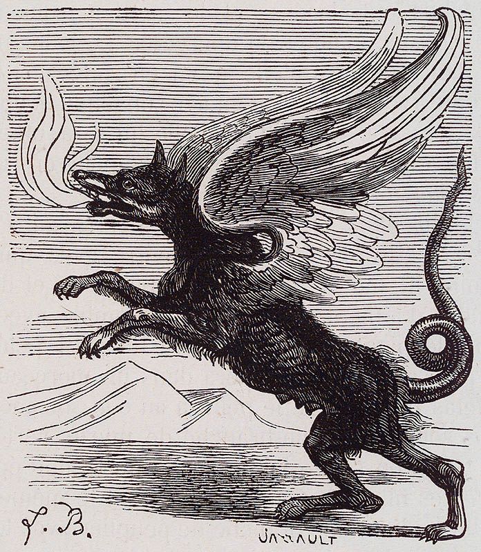 A wolf with a serpent’s tail, breathing fire.