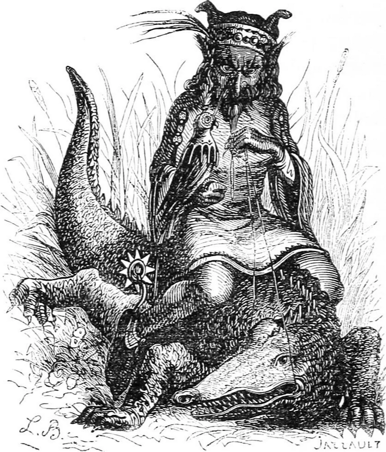 Riding a crocodile, which symbolizes power, danger, and control over the primal forces of nature.