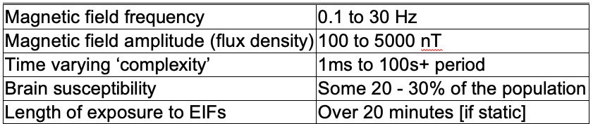 EIFs for a significant time, say 20 to 30 minutes, before hallucinations are reported. This applies if the person is static. I will mention people moving around in fields later on. There is, therefore, an important exposure component to EIFs – the effects are not instantaneous.